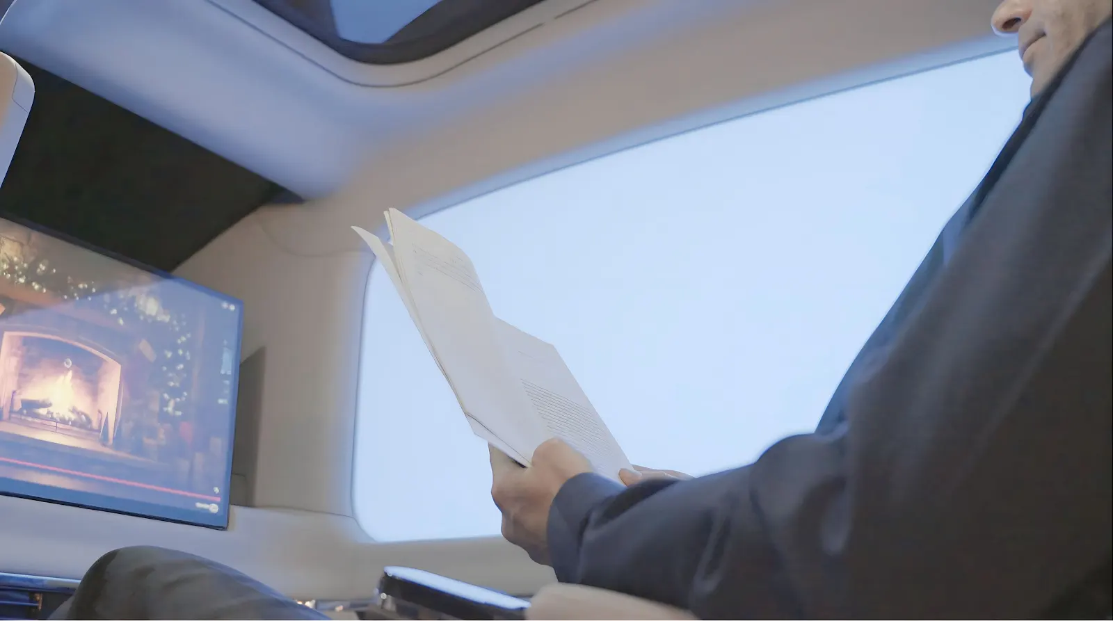 A retractable workstation with a large display and side table allows you to work, review, or create comfortably while moving through the city.